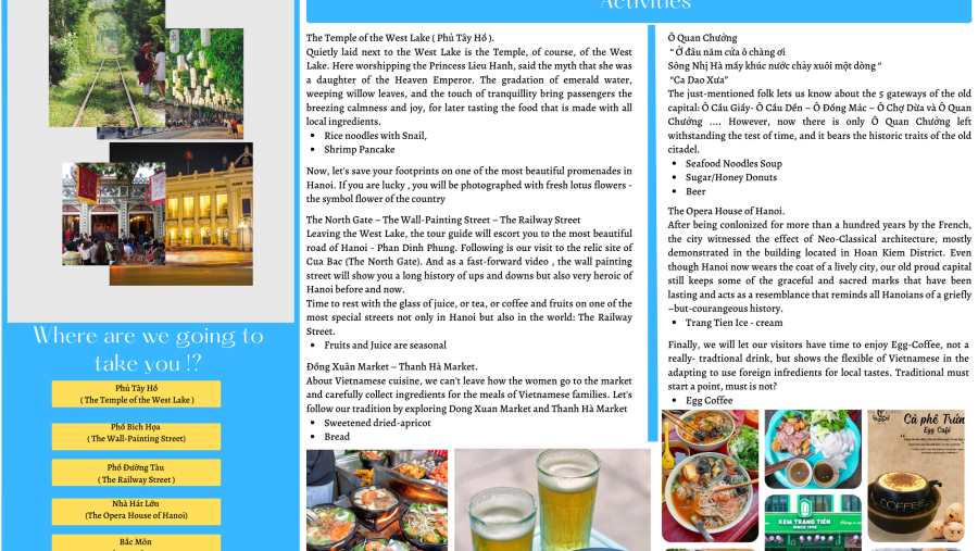 - Head to the North Gate to the Wall-Painting Street and the Railway Street: Leave West Lake, and the tour guide will escort you to the most beautiful road of Hanoi - Phan Dinh Phung. Following is our visit to the relic site of Cua Bac (The North Gate). And as a fast-forward video, the wall painting street will show you a long history of ups and downs but also very heroic of Hanoi before and now. Rest with a glass of juice, tea, or coffee and fruits on one of the most special streets not only in Hanoi but also in the world: Railway Street. (Fruits and Juice are seasonal.)