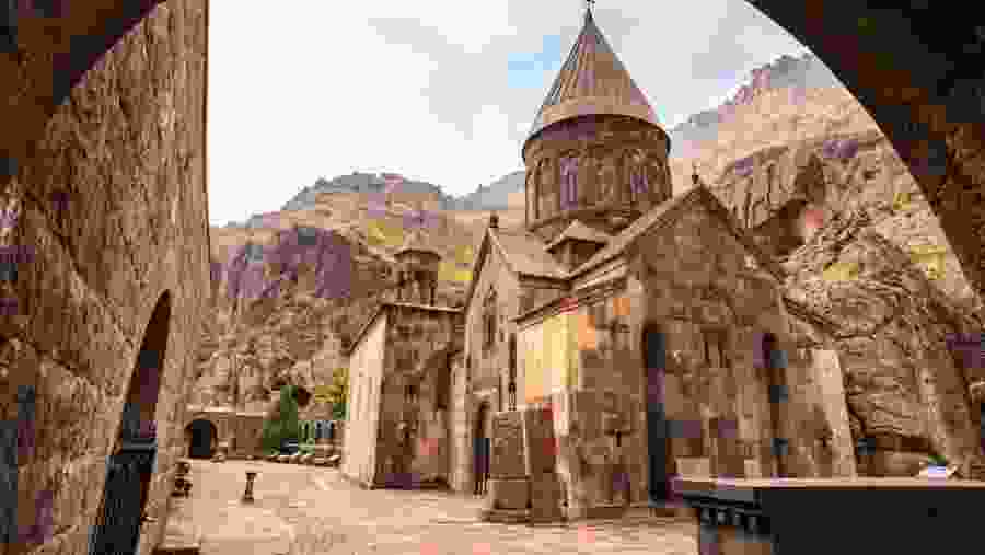 Geghard Monastery is a medieval monastery in the Kotayk province, being partially carved out of the adjacent mountain, surrounded by cliffs. The name commonly used for the monastery today, Geghard, or more fully Geghardavank, meaning “the Monastery of the Spear”, originates from the spear which had wounded Jesus at the Crucifixion. It is believed, that the spear was brought to Armenia by Apostle Jude, called here Thaddeus, and stored amongst many other relics. Now it is displayed in the Echmiadzin treasury. The monastery complex is listed as a UNESCO World Heritage Site with enhanced protection status.